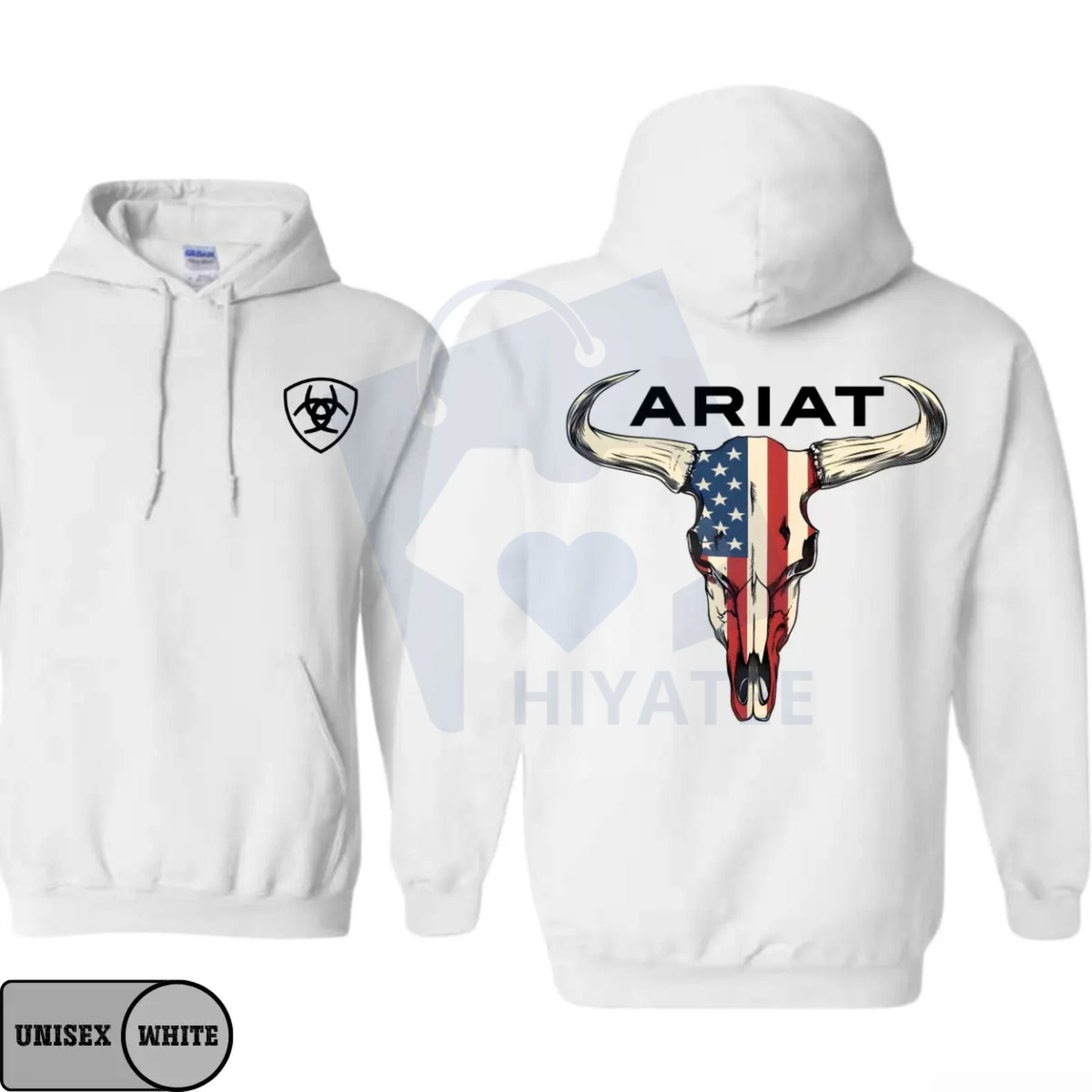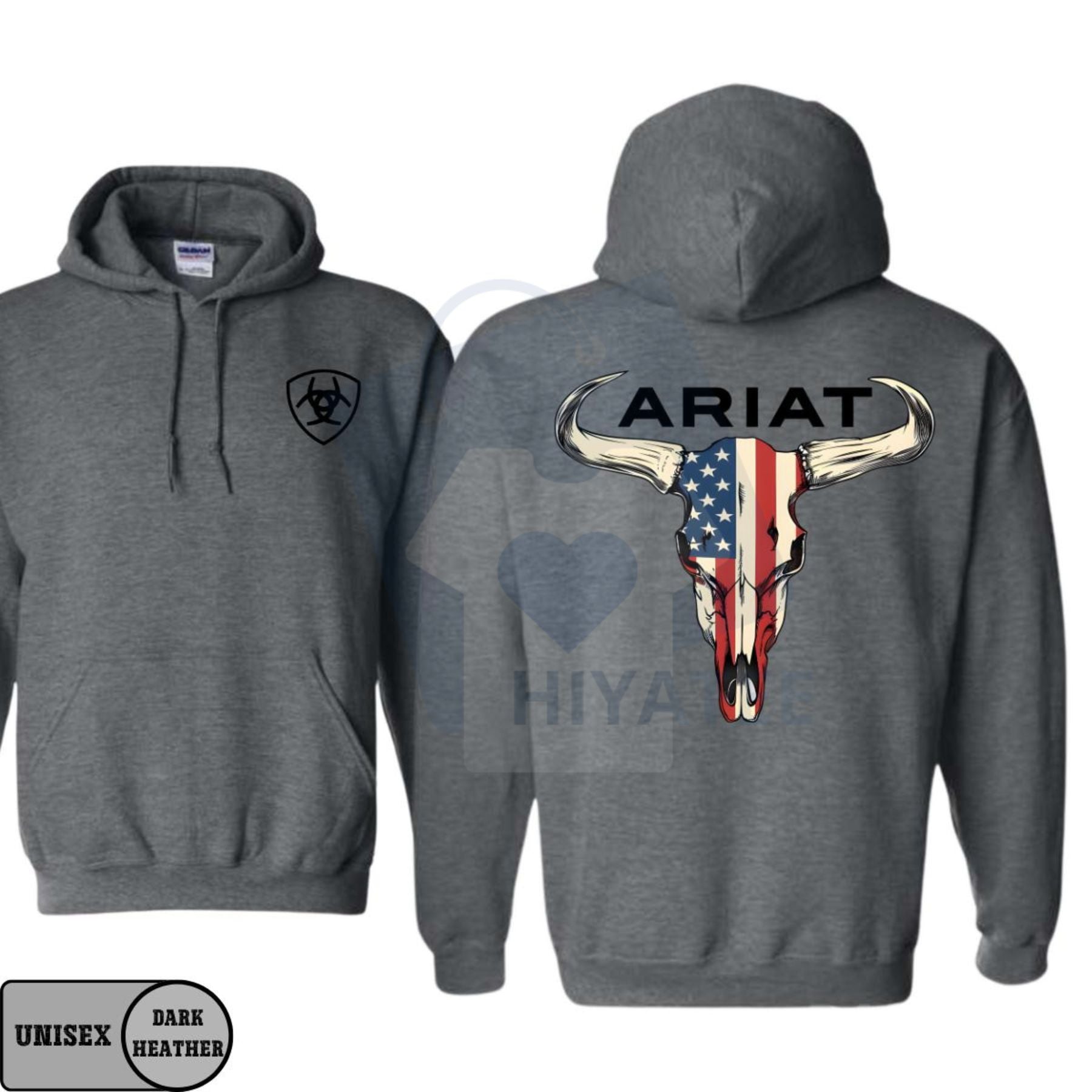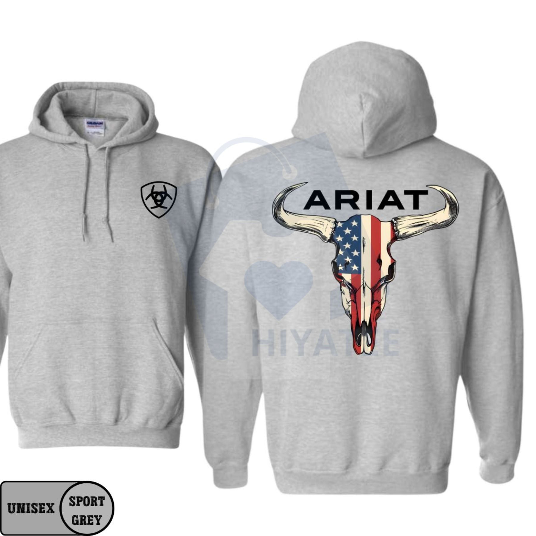 Ariat Hoodie – American Flag Bull Skull Western Cowboy Pullover, Rodeo Ranch Style Sweatshirt, Country Farm Work Outfit, Gift for Men & Women