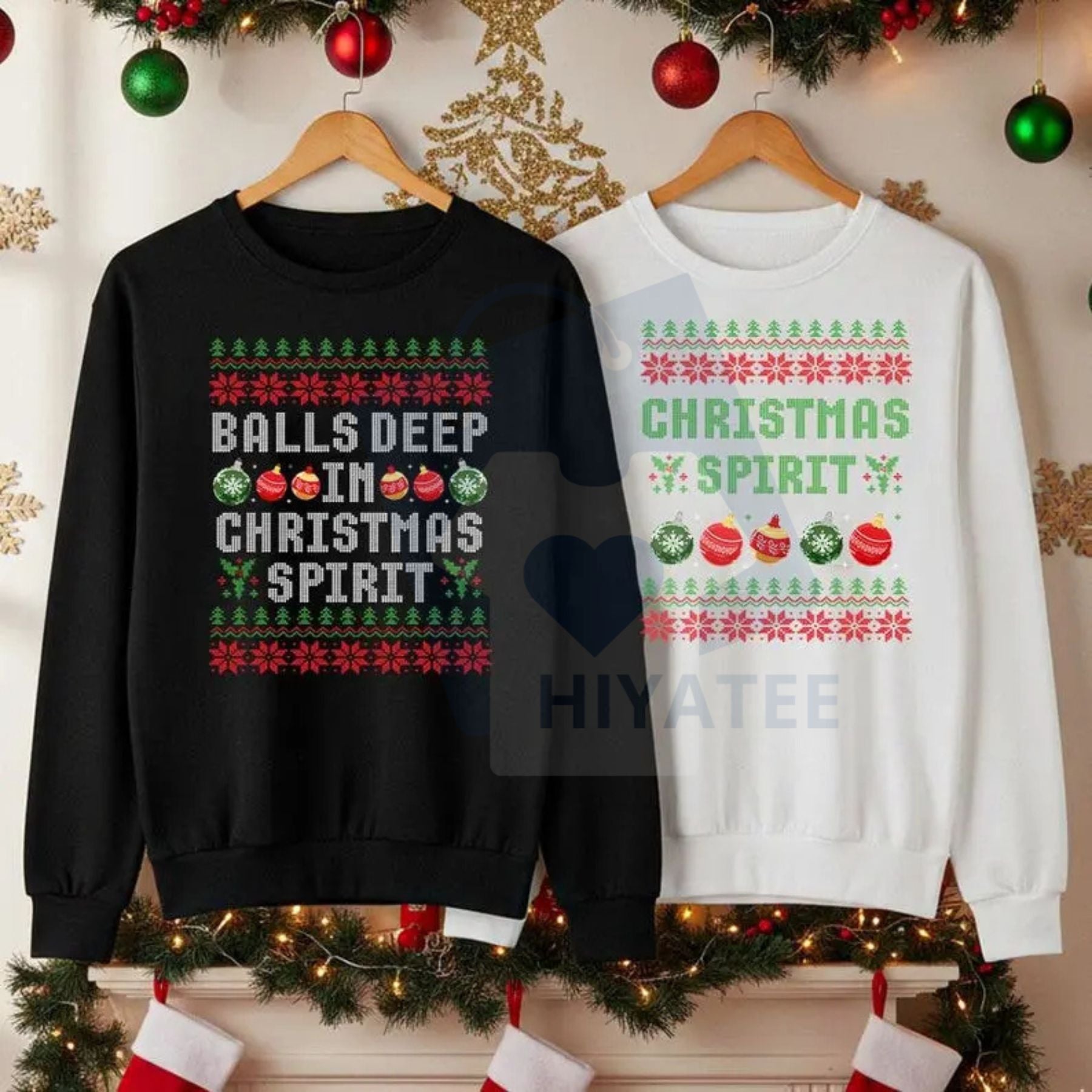 • Adult Humor Slogan: Features the bold, funny phrase "Balls Deep in Christmas Spirit."