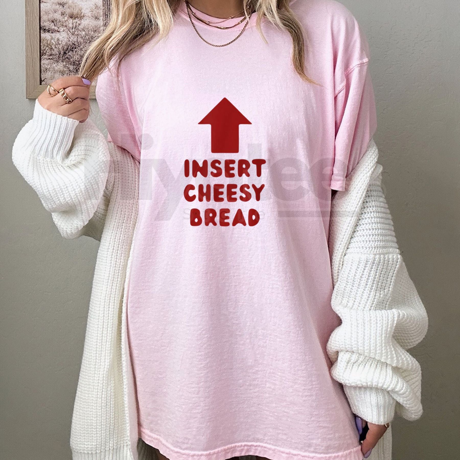 - Hilarious "Foodie" Graphic: Features a bold arrow pointing to the mouth with the witty "Insert Cheesy Bread" slogan.