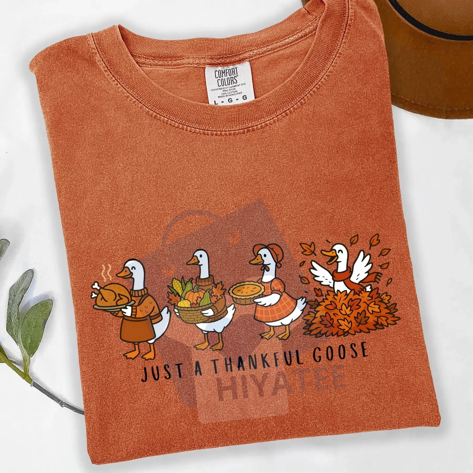 • Funny Goose Graphic: A humorous and cute "Just a Thankful Goose" print that is perfect for Thanksgiving.
