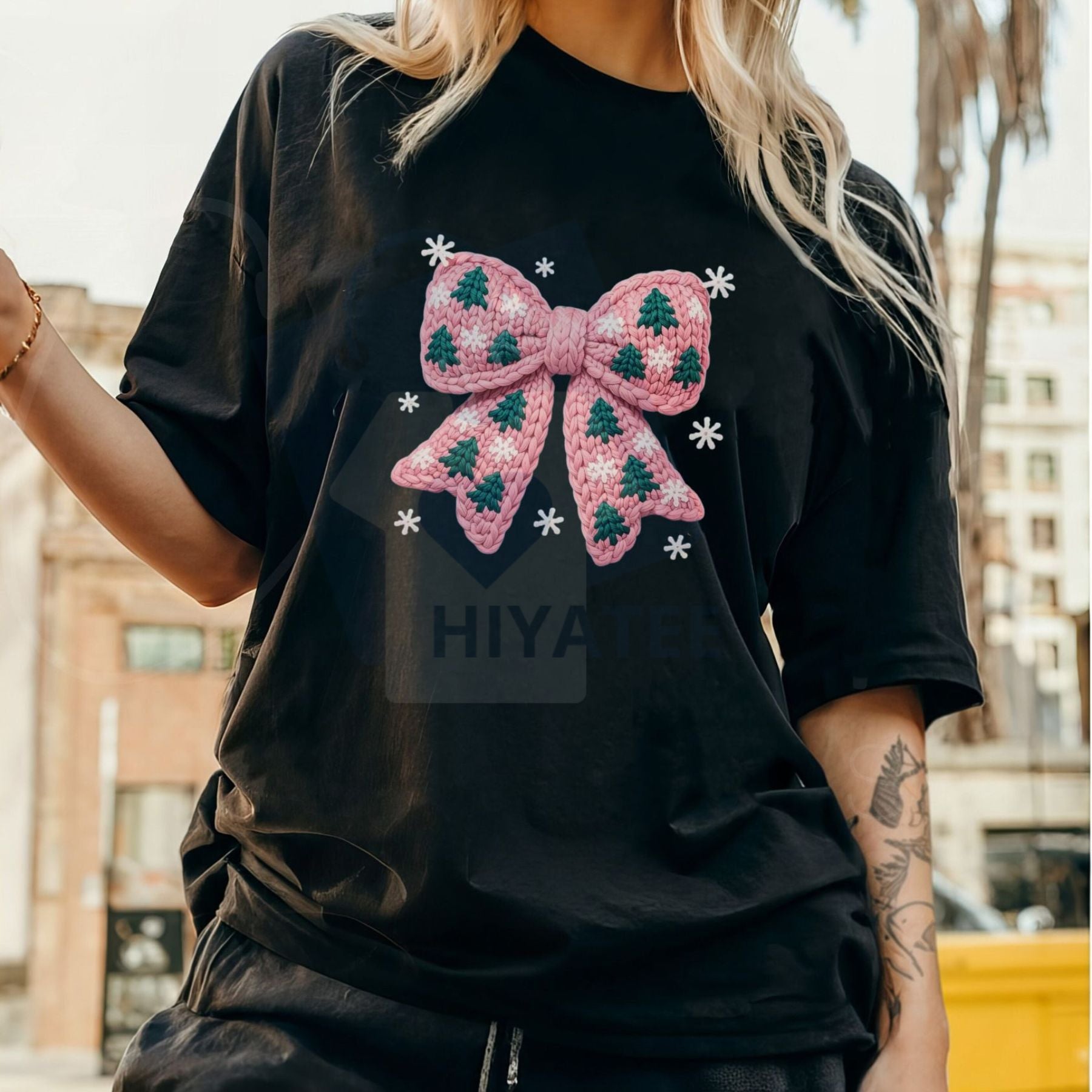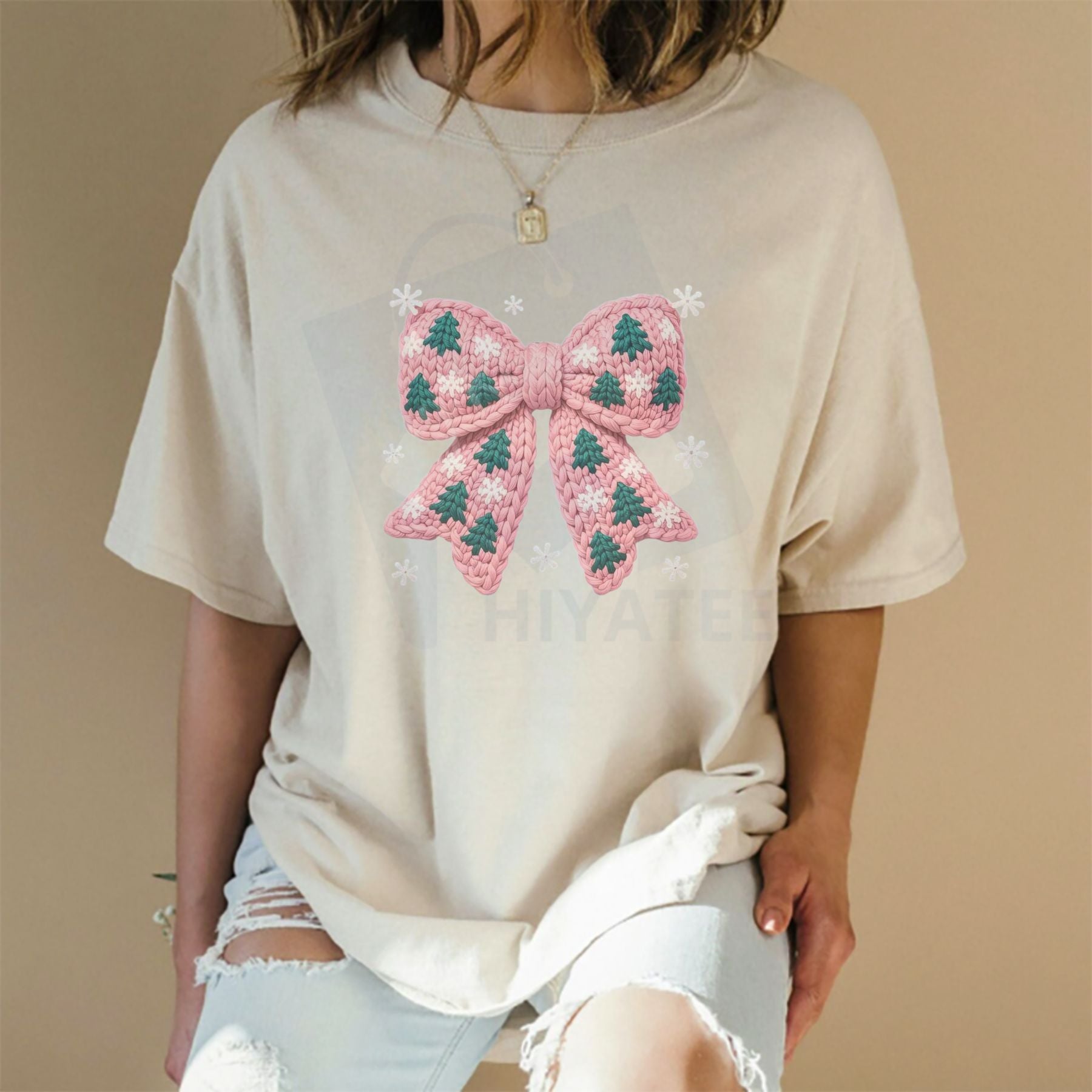 Knit Tree Bow Comfort Colors T-Shirt – Trendy Women's Christmas Tee