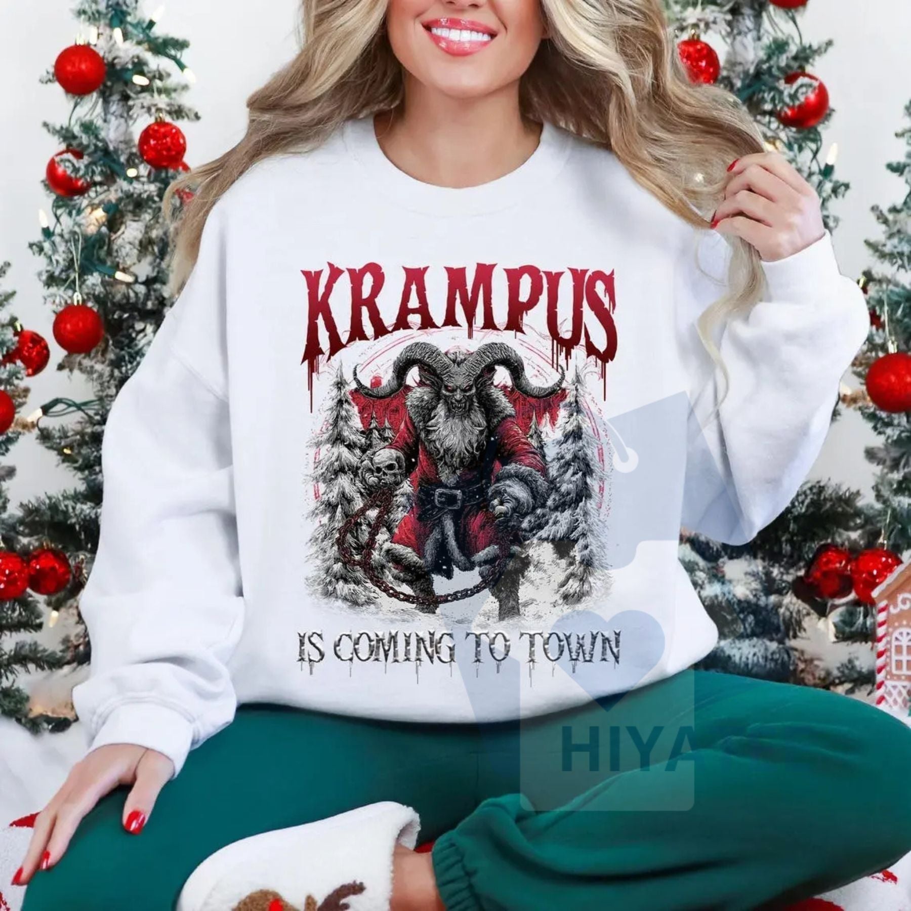 😈🔥 You Better Watch Out, You Better Not Cry... Krampus Is Coming! Skip the sweetness this year and celebrate the dark side of Christmas with the Krampus Is Coming To Town Sweatshirt! This thrilling top features a menacing design of the Alpine demon, making a terrifying and hilarious contrast to the usual holiday cheer. It's the ultimate Gothic Christmas Shirt for those who prefer dark folklore over traditional festivities.