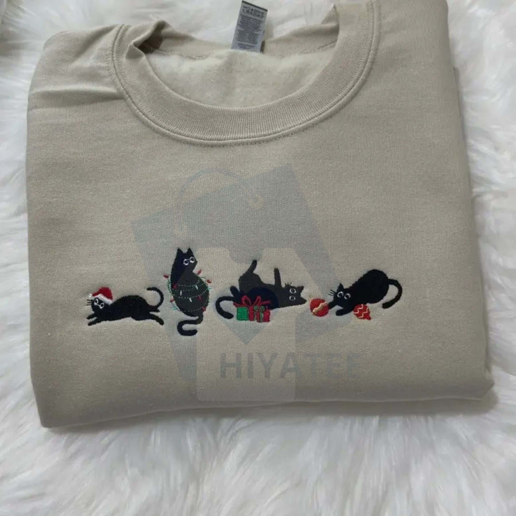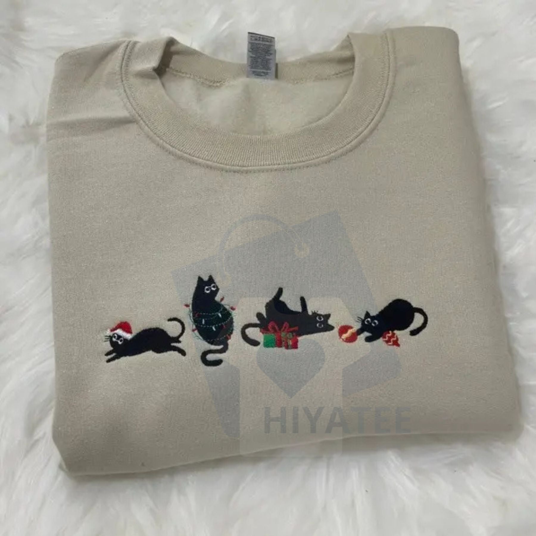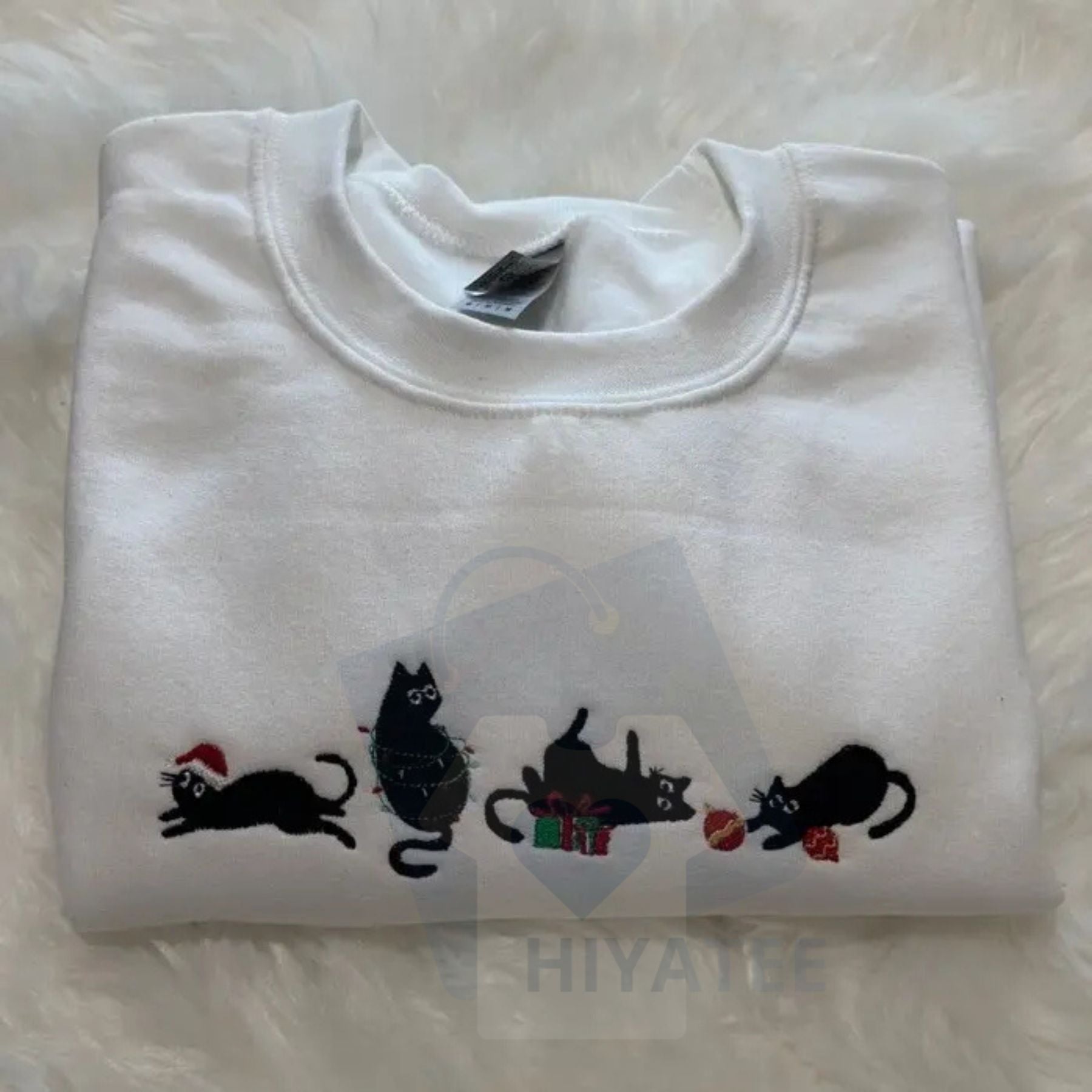 Meowy Christmas Black Cats Embroidered Sweatshirt – Unisex Holiday Cat Lover Crewneck