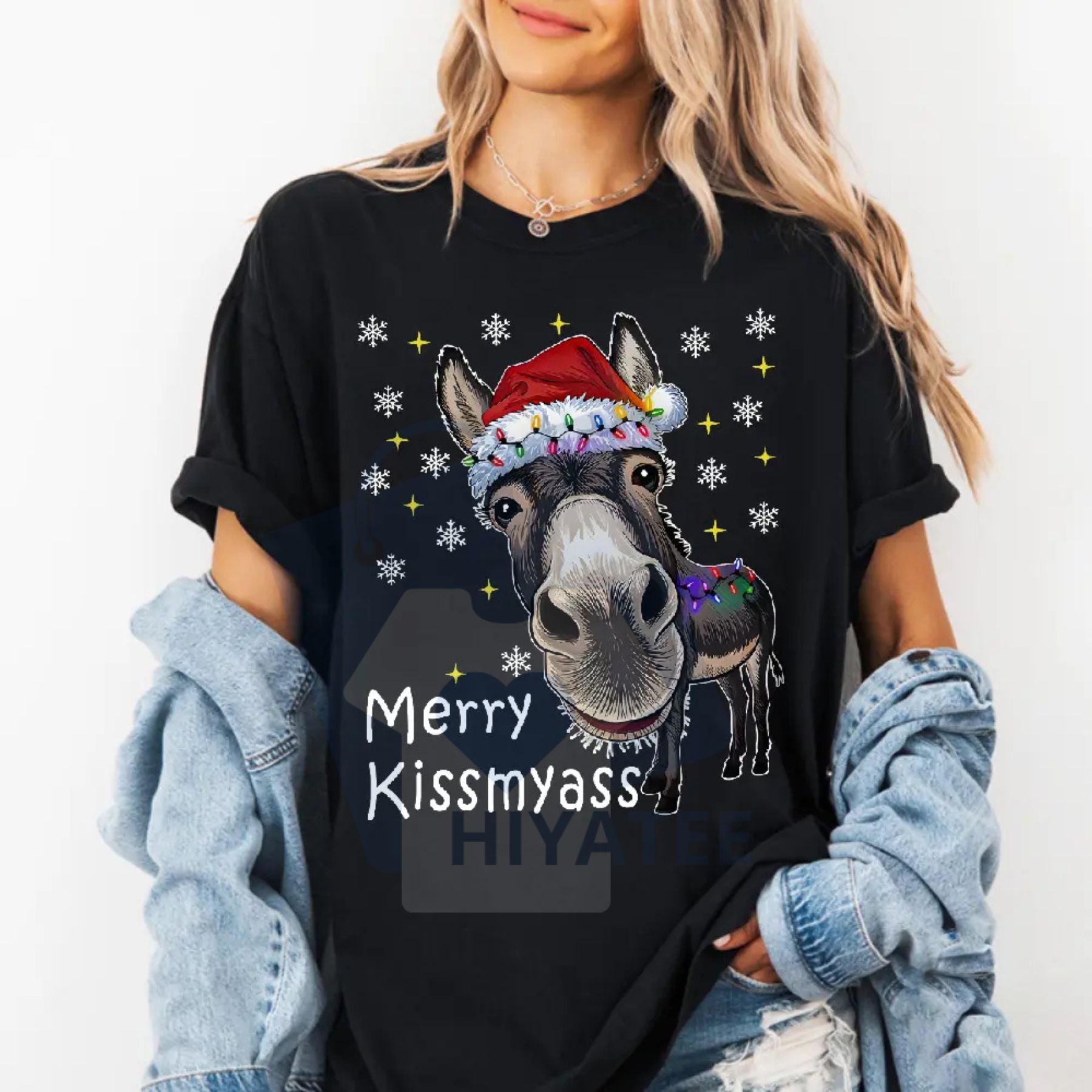 Funny Donkey Santa Hat "MERRY KISSMYASS" Christmas T-Shirt – Unisex Adult Humor Holiday Tee