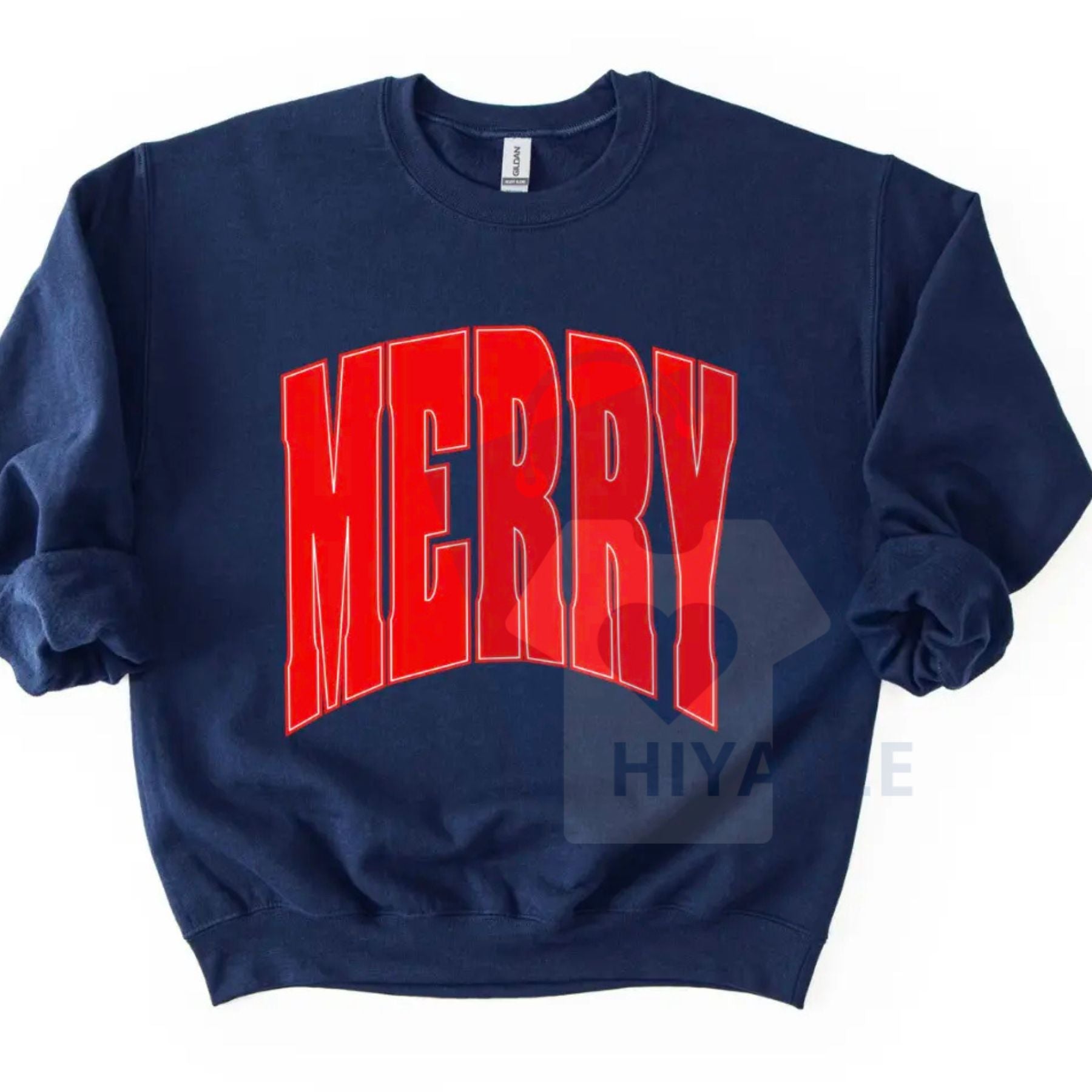 Merry Oversized Print Christmas Sweatshirt: Cozy Loose Fit Holiday Pullover, Trendy Festive Graphic Crewneck, Unisex Gift Idea