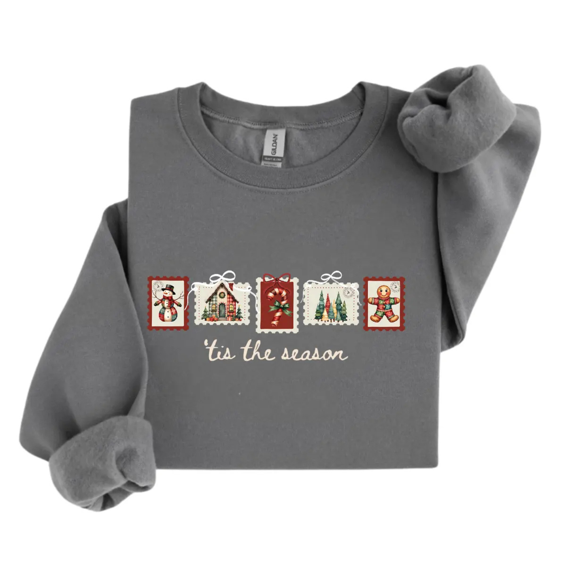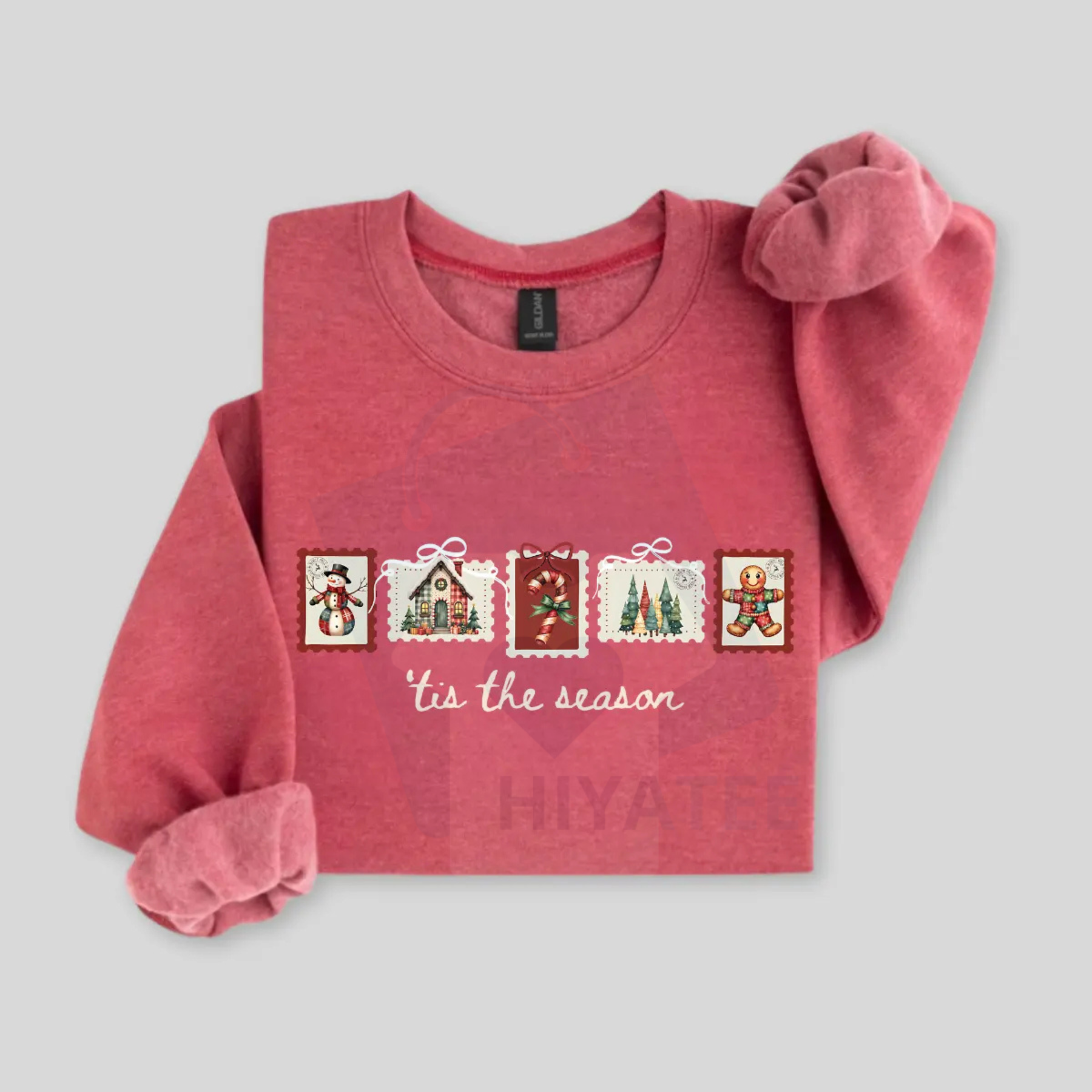 Retro Winter Stamp Sweatshirt: Patchwork Christmas Stamps Sweater, Coquette Holiday Crewneck, Vintage Xmas Gift