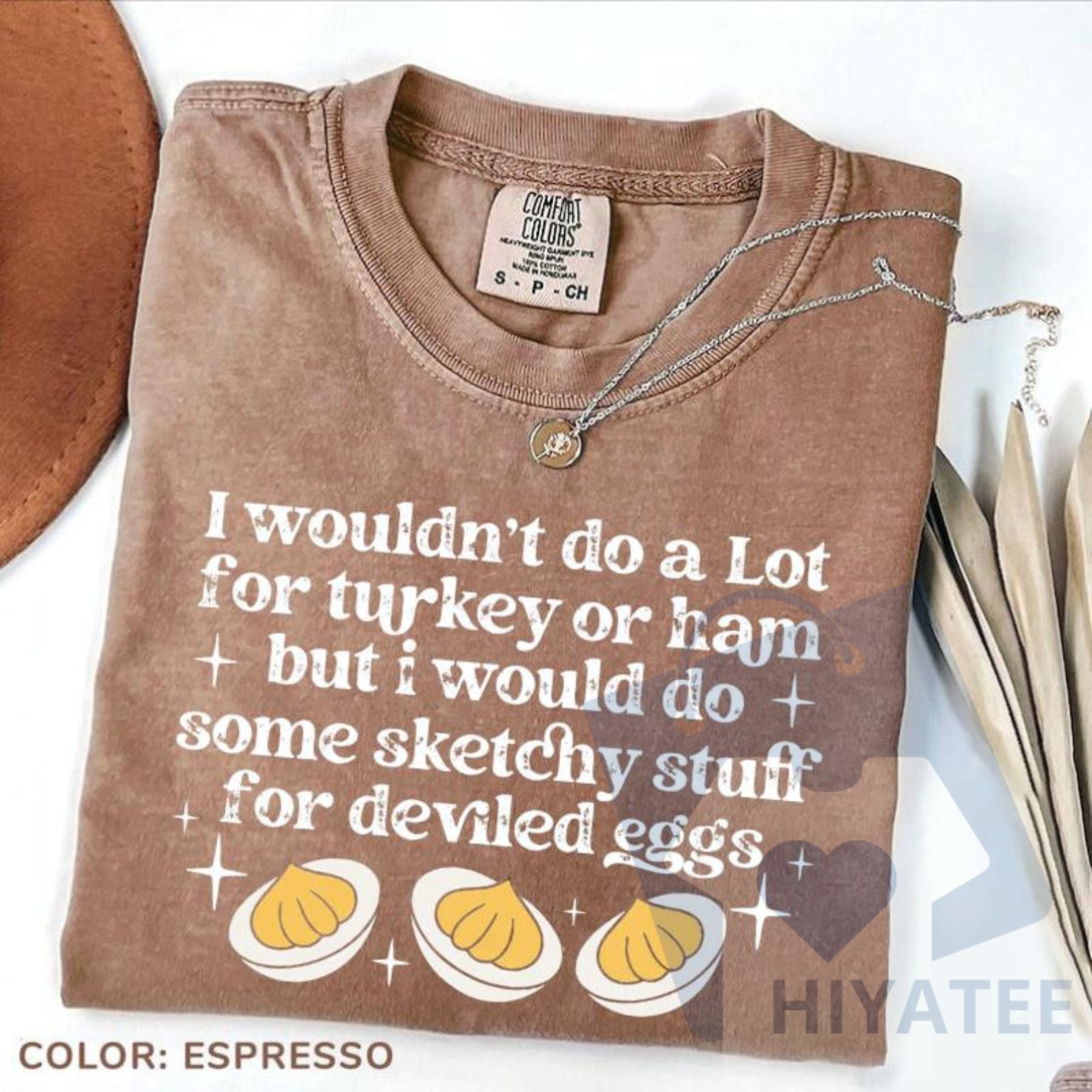 🥚😈 Priorities: Deviled Eggs Over Everything. Forget the turkey and ham; we know what the real star of the holiday table is! Our Comfort Colors "I Wouldn't Do A Lot for Turkey or Ham But I’d Do Sketchy Things" Shirt is the ultimate expression of holiday priorities, complete with hilarious Deviled Egg Humor. This tee is perfect for the friend, relative, or food enthusiast who takes their side dishes very seriously.