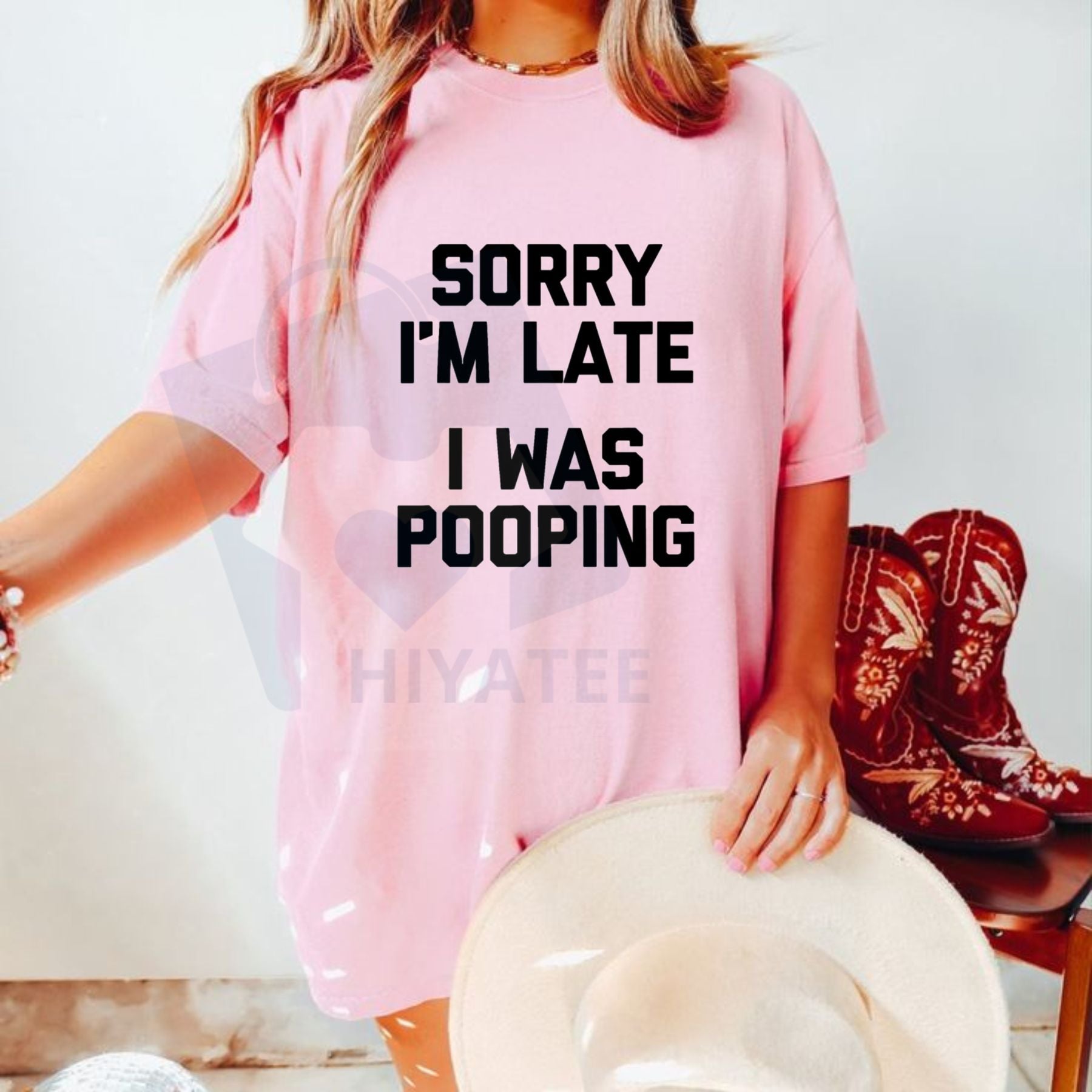 - Funny Slogan: Features the bold, Funny Sarcastic phrase: "Sorry I'm Late, I Was Pooping."