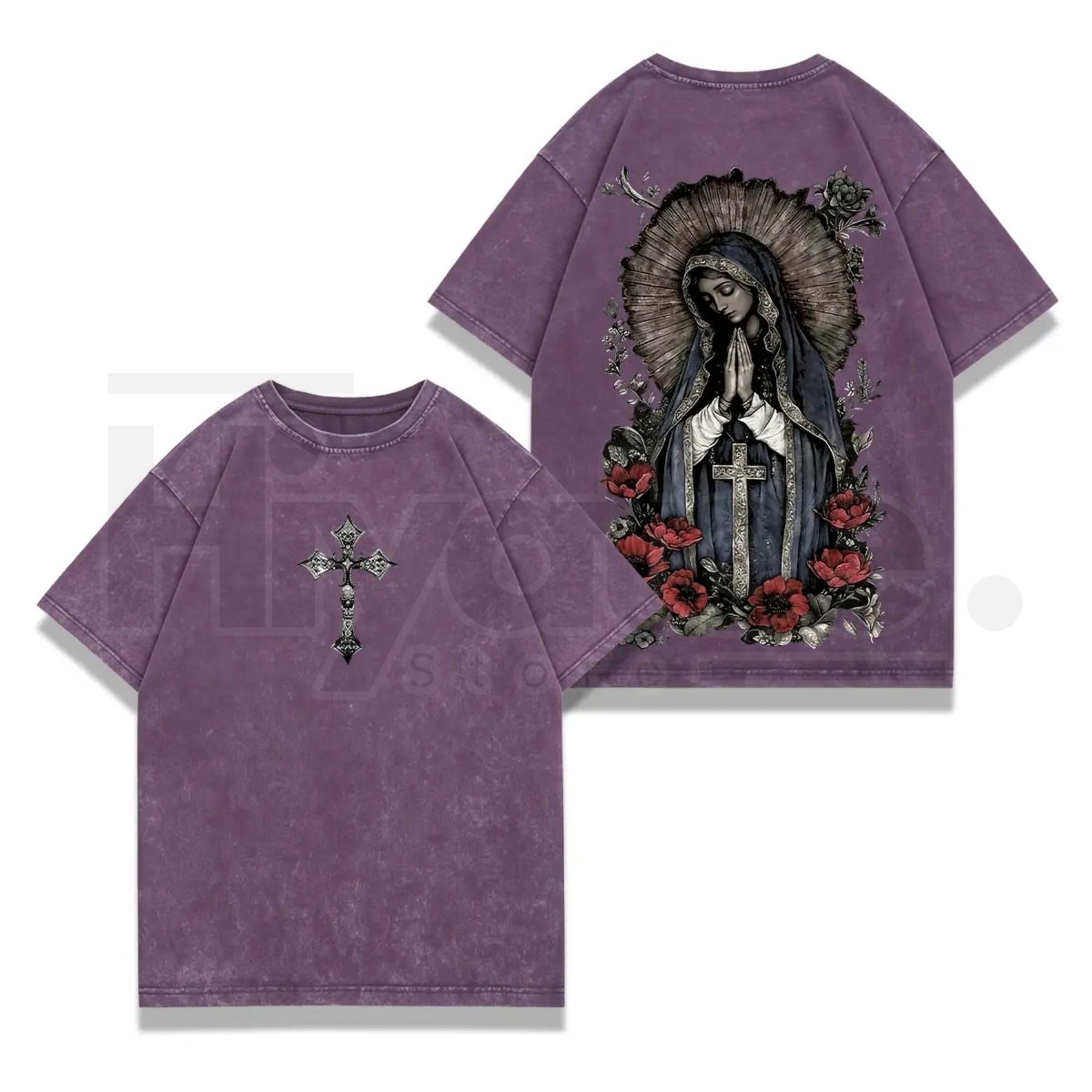 Features a detailed Virgin Mary graphic inspired by traditional iconography.